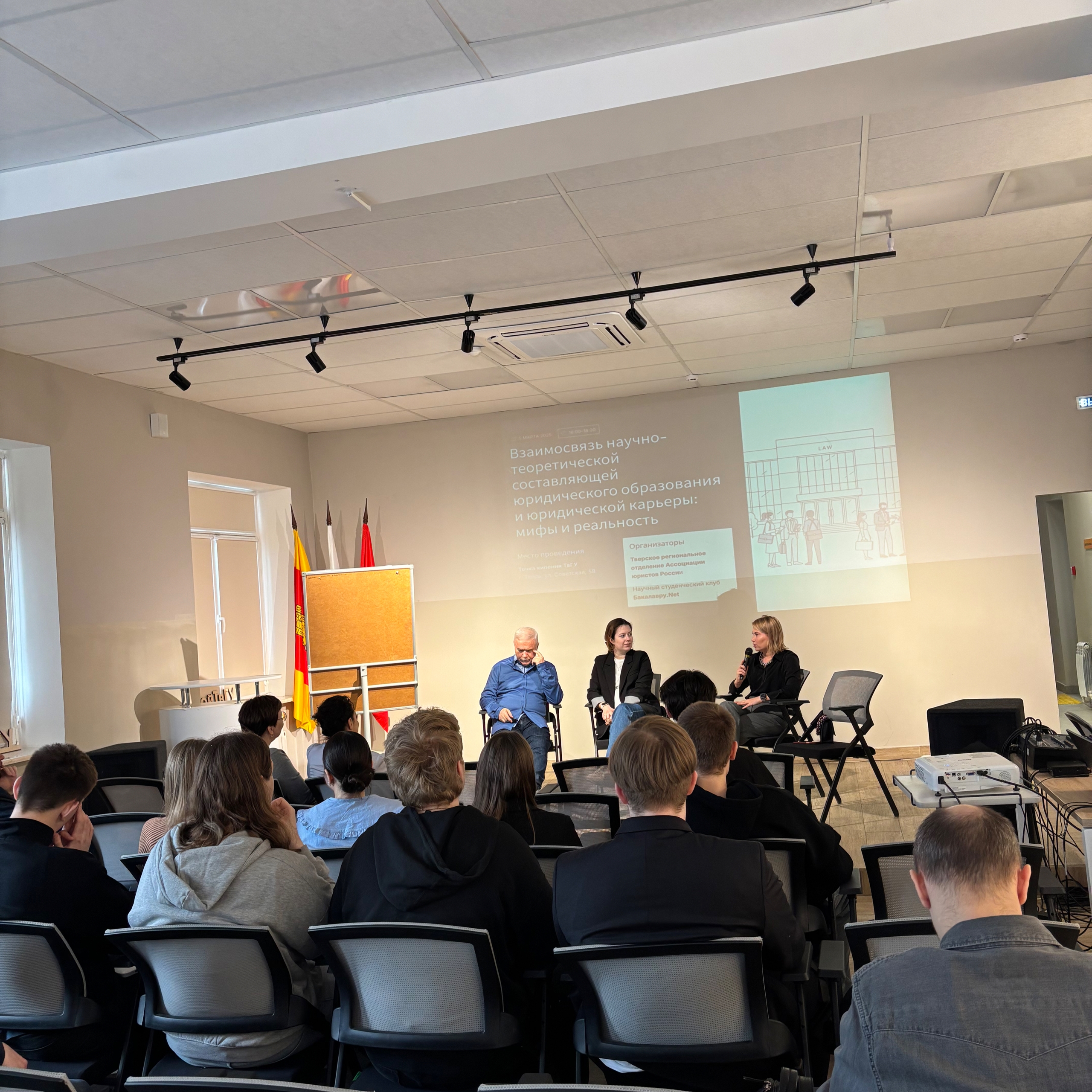 5 марта в Точке кипения ТвГУ в Твери по инициативе Тверского регионального отделения Ассоциации юристов России, Научного студенческого клуба юридического факультета ТвГУ и Бакалавру.Net прошла встреча-дискуссия «Взаимосвязь научно-теоретической составляющей юридического образования и юридической траектории: мифы и реальность». К участию были приглашены студенты-юристы, преподаватели и практикующие юристы. Модератором мероприятия выступил Владимир Иванович Крусс - доктор юридических наук, профессор, заведующий кафедрой теории государства и права Тверского государственного университета. В центре обсуждения находились вопросы соотношения фундаментальной юридической подготовки и практико-ориентированного развития будущего юриста, а также влияние научно-теоретической базы на выбор и построение профессиональной траектории. Участники обсудили, какие представления о юридическом образовании и карьере можно считать устойчивыми, а какие требуют переосмысления в современных условиях. Особый интерес вызвали выступления практикующих юристов, которые делились тем, как знание теории государства и права помогает им в профессиональной деятельности. Отмечалось, что именно фундаментальная теоретическая подготовка позволяет глубже понимать природу правовых явлений, точнее интерпретировать нормы права, выстраивать правовую позицию и видеть за частным спором более широкий юридический контекст. Мероприятие стало площадкой для содержательного диалога между юридическим сообществом, преподавателями и студентами. Такое взаимодействие имеет особое значение для профессиональной ориентации будущих юристов и укрепления связи между академической средой и юридической практикой. Для Тверского регионального отделения Ассоциации юристов России поддержка подобных инициатив остается важным направлением работы, поскольку именно на стыке образования, науки и практики формируется профессиональная правовая среда и будущий кадровый потенциал юридического сообщества региона.